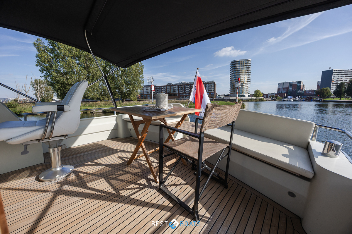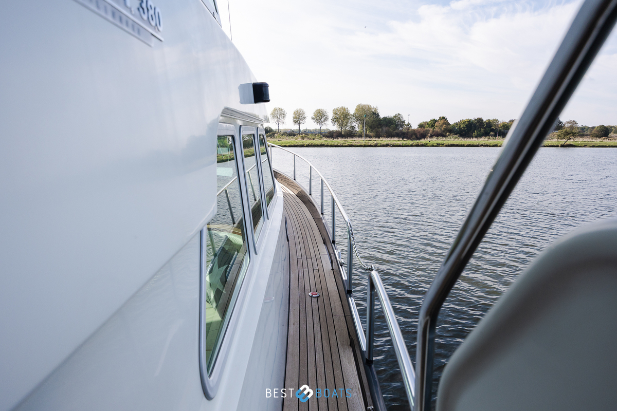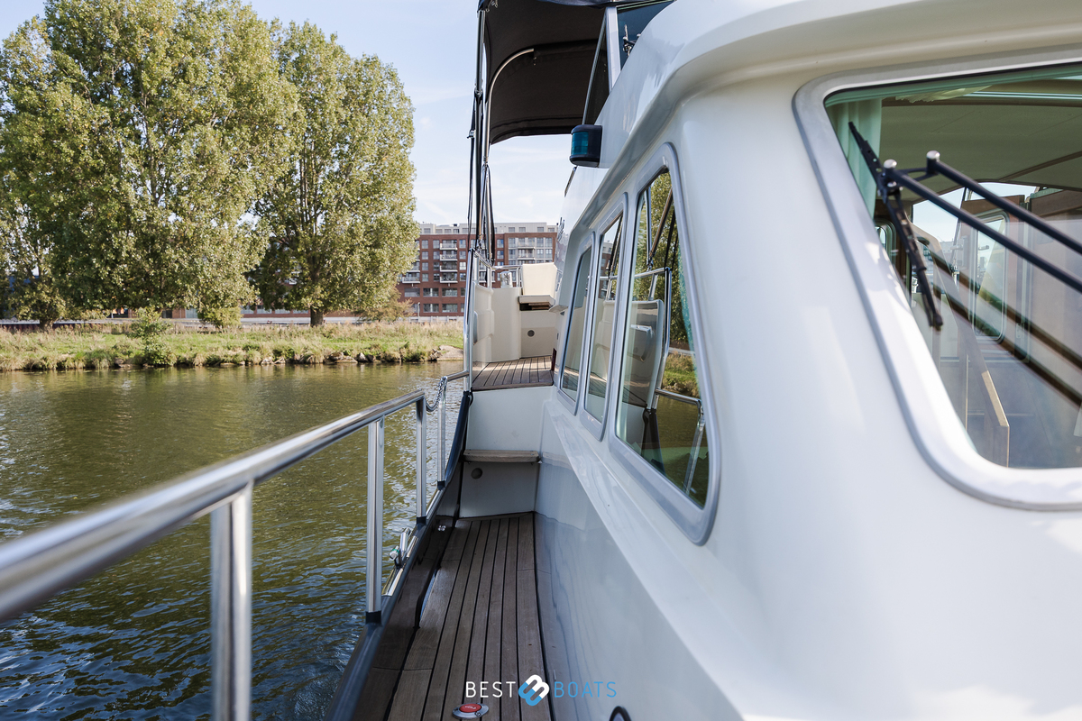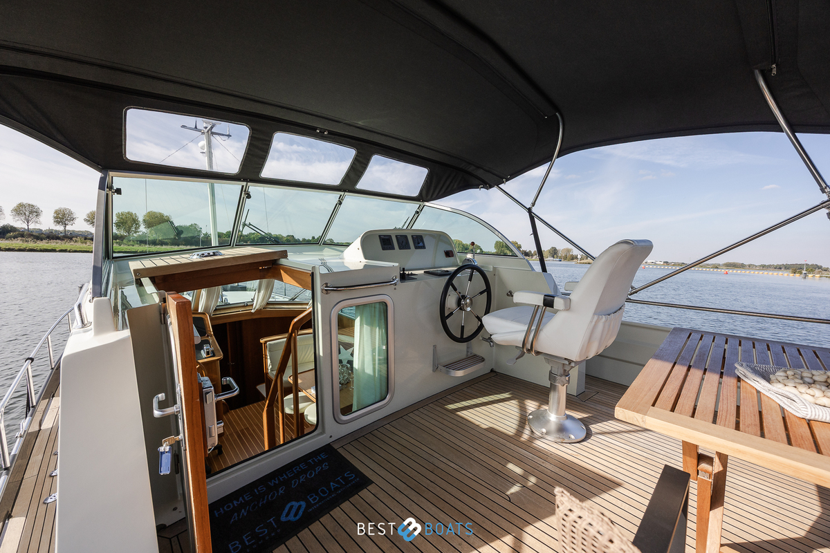 Buitendeks valt meteen het hoogwaardige teakdek op dat rondom het schip is aangebracht, wat niet alleen een luxe uitstraling geeft maar ook praktisch is in gebruik. De kuiptent en bimini zorgen ervoor dat u onder alle weersomstandigheden comfortabel kunt vertoeven, terwijl het geïntegreerde zwemplatform met RVS zwemtrap uitnodigt tot een verfrissende duik. Ook de elektrische ankerlier, bedienbaar vanaf de buitenstuurstand, draagt bij aan het gebruiksgemak.