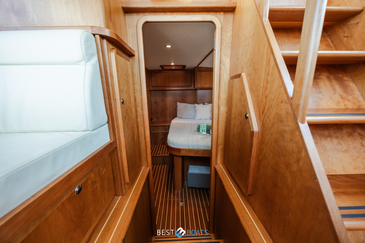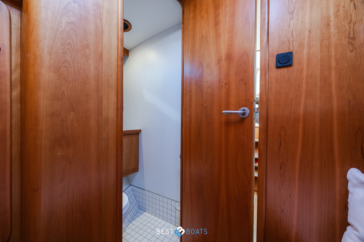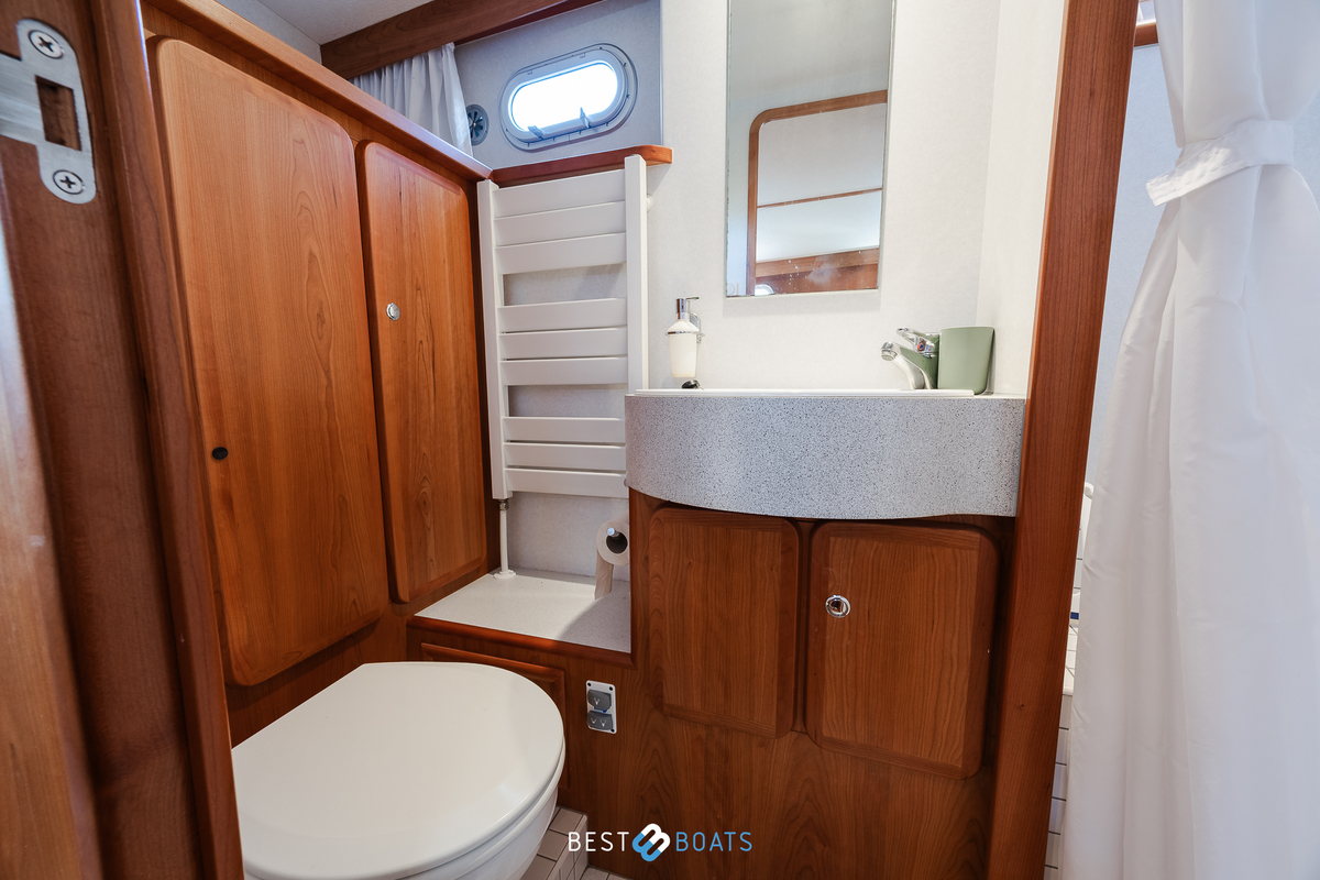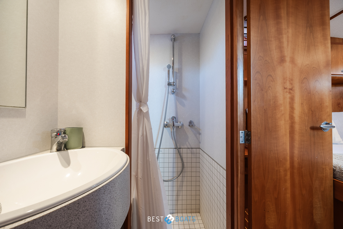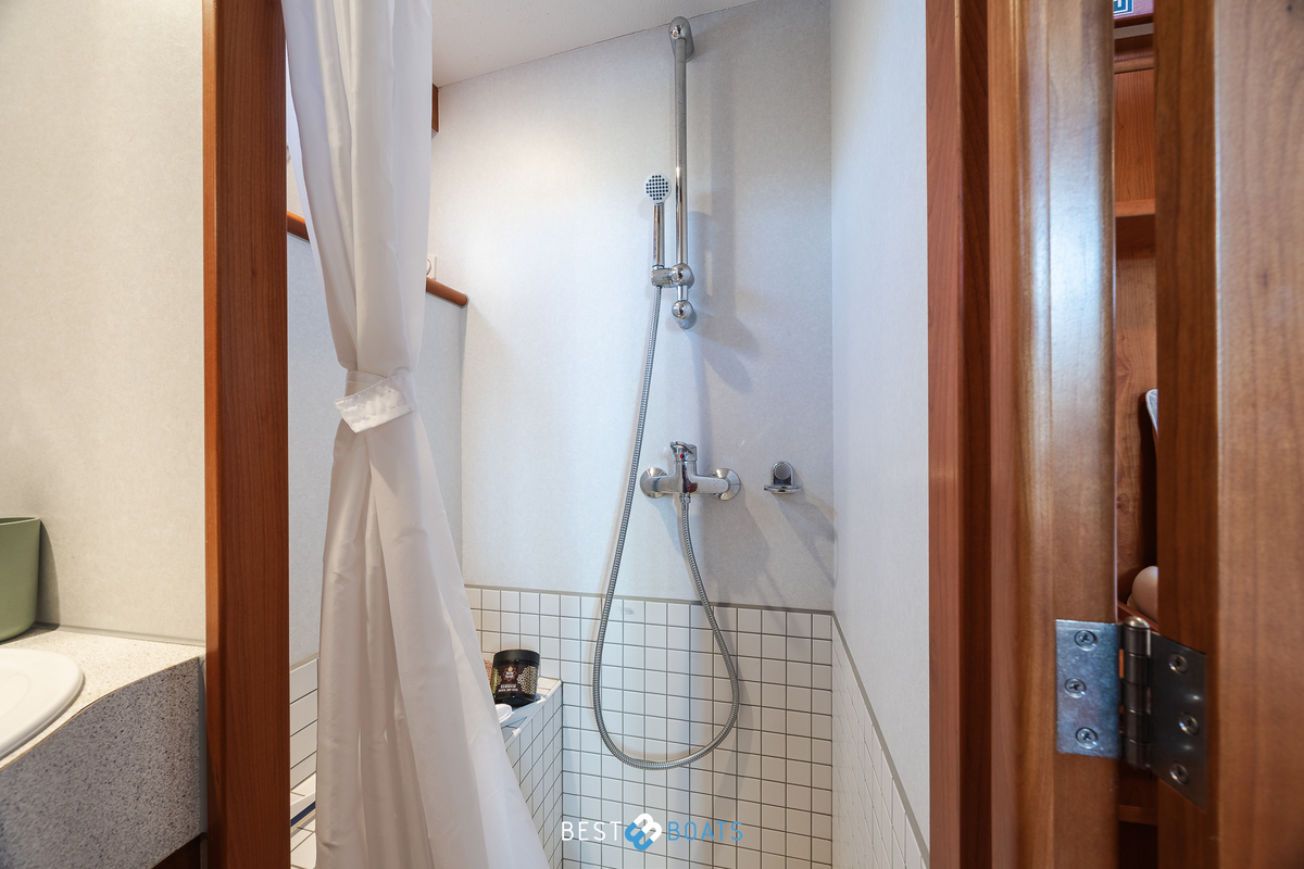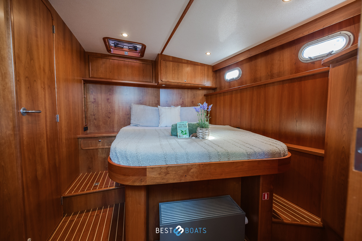 Aan boord ervaart u direct de warme, uitnodigende sfeer die kenmerkend is voor Linssen. De salon is stijlvol ingericht en biedt volop zitruimte om te ontspannen en te genieten van het uitzicht. In het vooronder bevindt zich een volledig uitgeruste kombuis met een driepits gaskooktoestel en een ruime koelkast met vriesvak, tegenover een gezellige dinette die eenvoudig kan worden omgebouwd tot extra slaapplaats. De gastenhut voorin beschikt over twee comfortabele eenpersoonsbedden en een eigen toilet, terwijl de royale eigenaarshut in het achterschip is voorzien van een ruim tweepersoonsbed en een privébadkamer met douche. In totaal zijn er vier vaste slaapplaatsen aan boord, met de mogelijkheid om er nog twee extra te creëren.