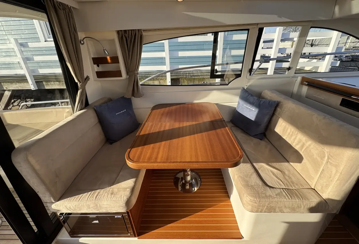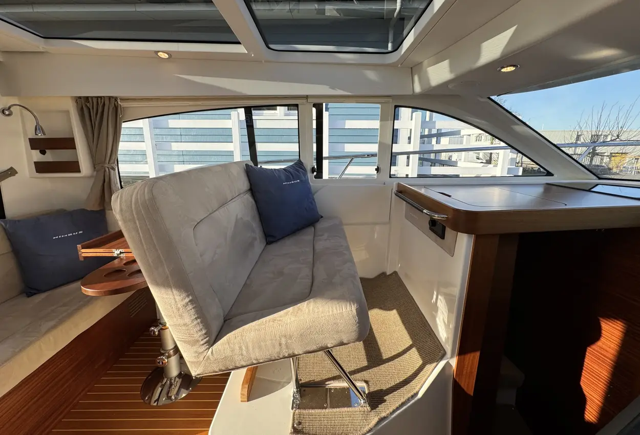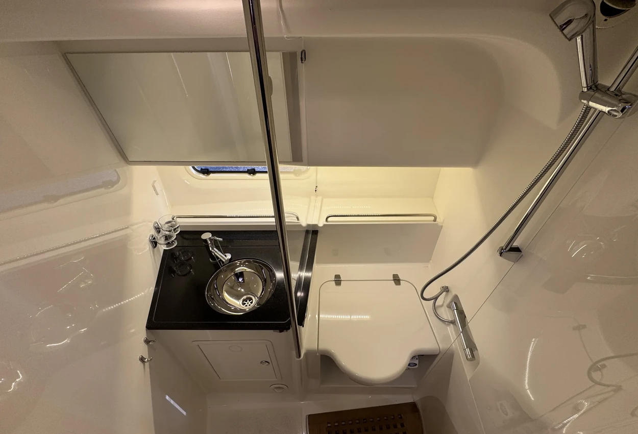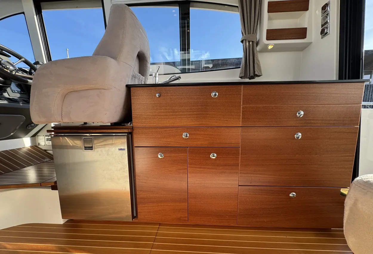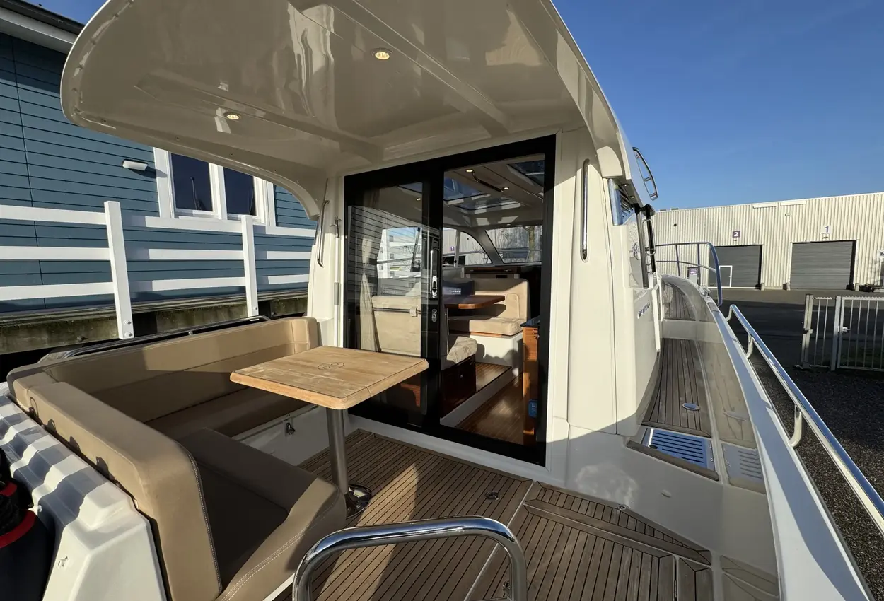 FeaturesThe bathing platform, aft deck, and saloon are on the same level. The saloon is spacious and airy, featuring a comfortable lounge-dining area, folding passenger bench, steering position, and galley. The wide flush-mounted sliding door next to the steering position allows easy access to the starboard side deck, facilitating sailing and maneuvering.