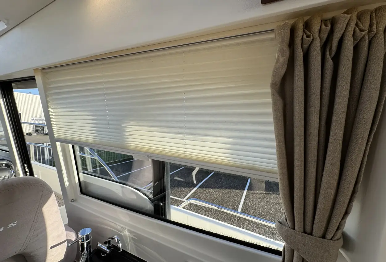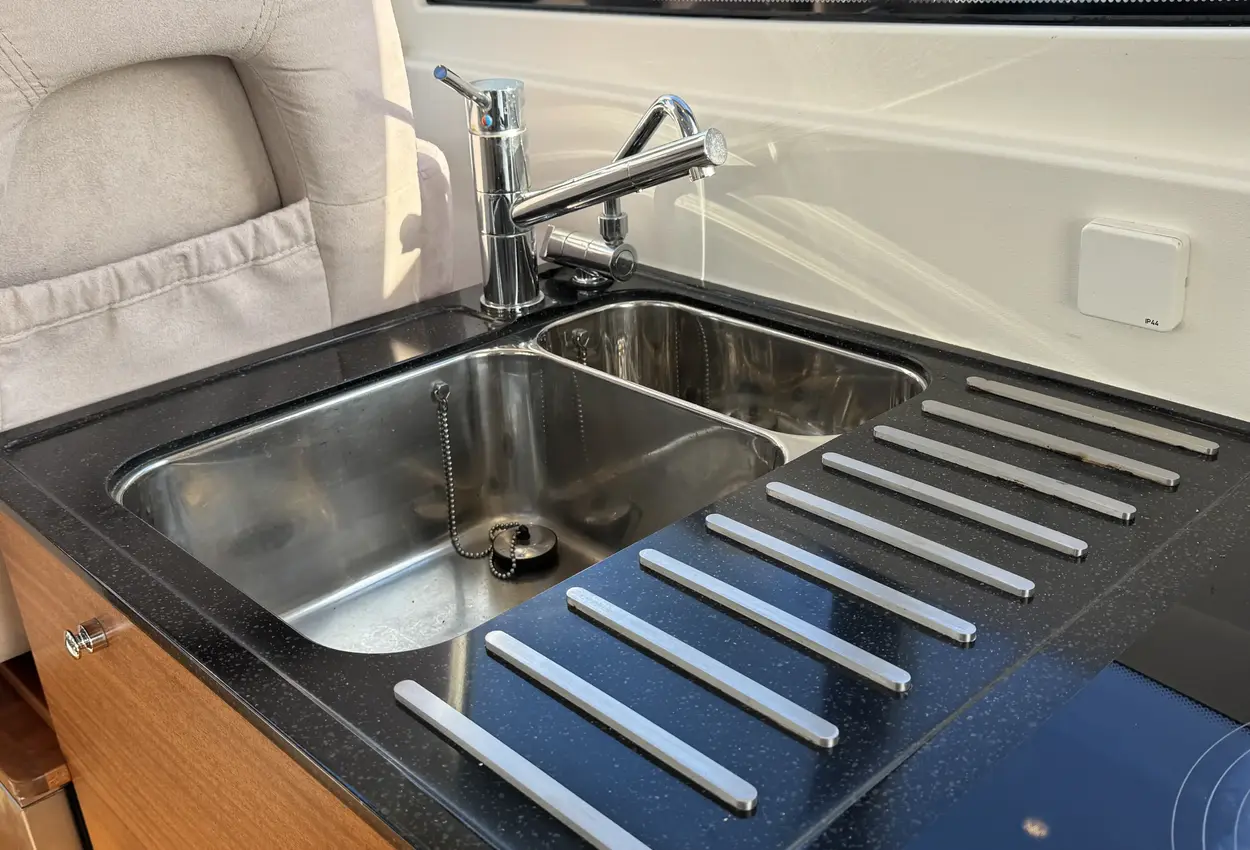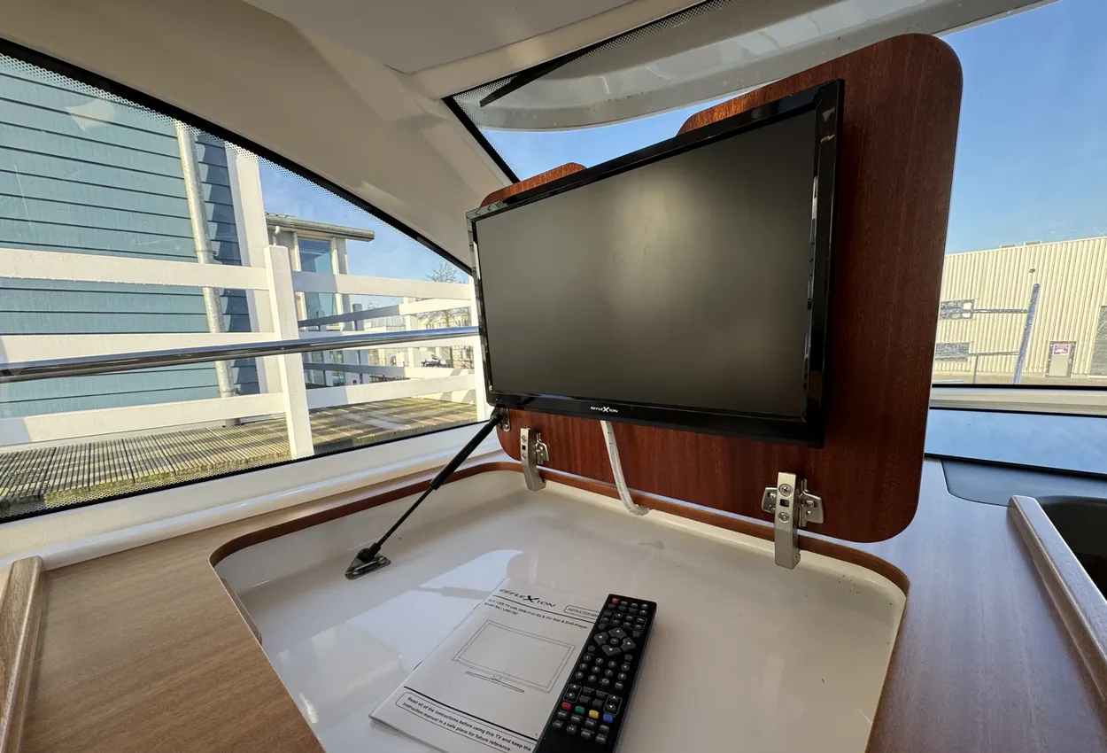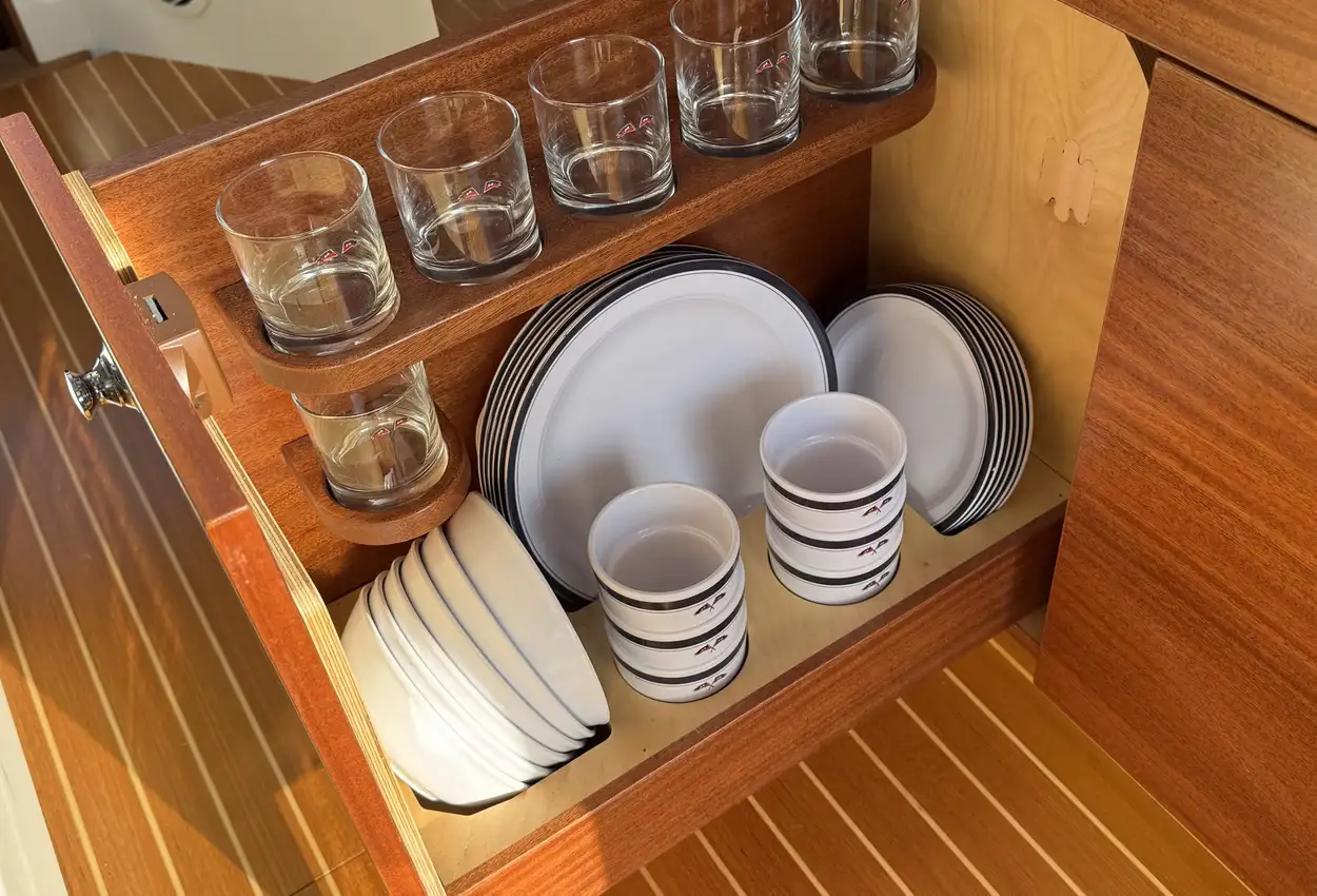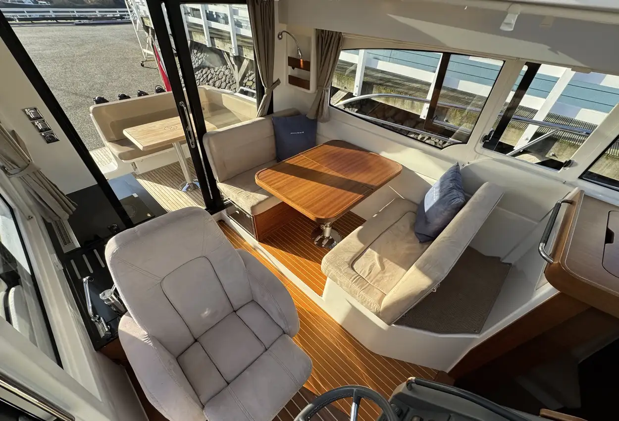FeaturesThe bathing platform, aft deck, and saloon are on the same level. The saloon is spacious and airy, featuring a comfortable lounge-dining area, folding passenger bench, steering position, and galley. The wide flush-mounted sliding door next to the steering position allows easy access to the starboard side deck, facilitating sailing and maneuvering.