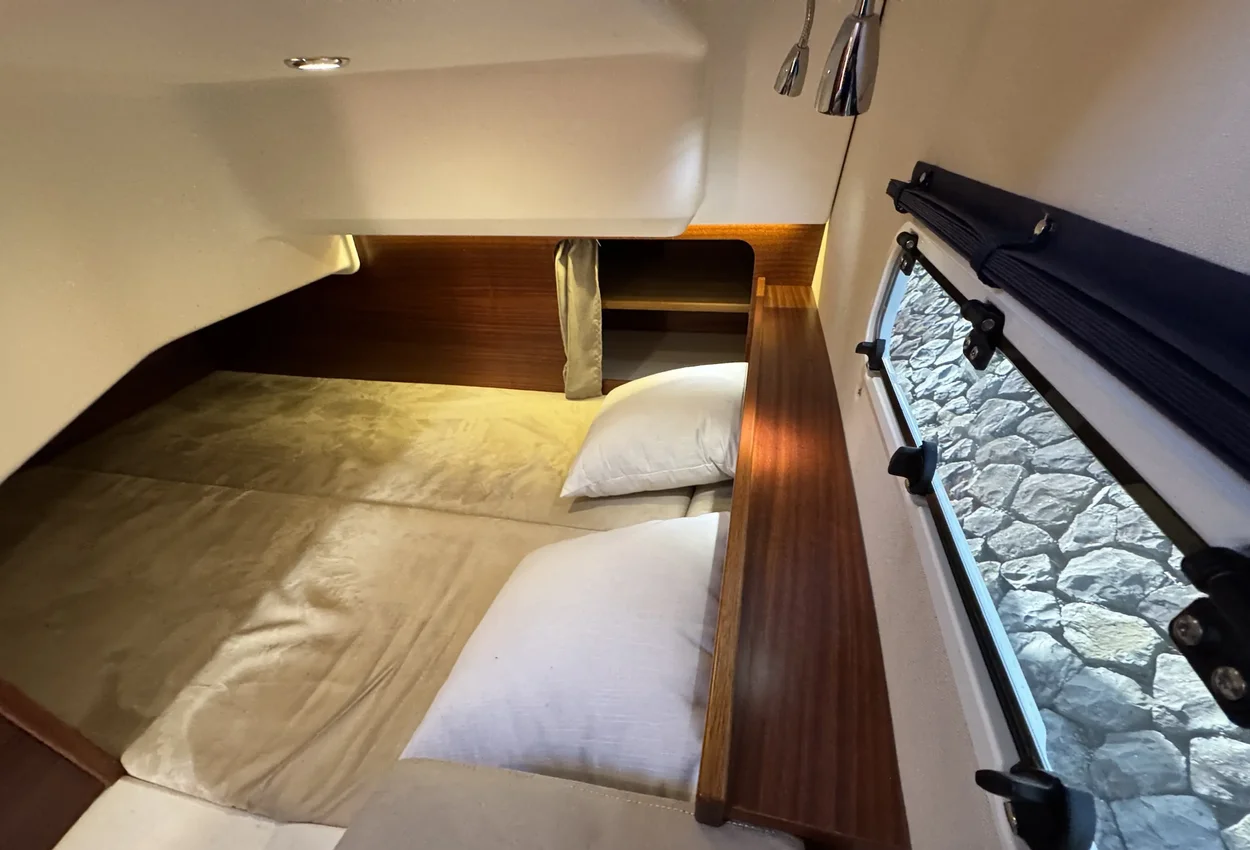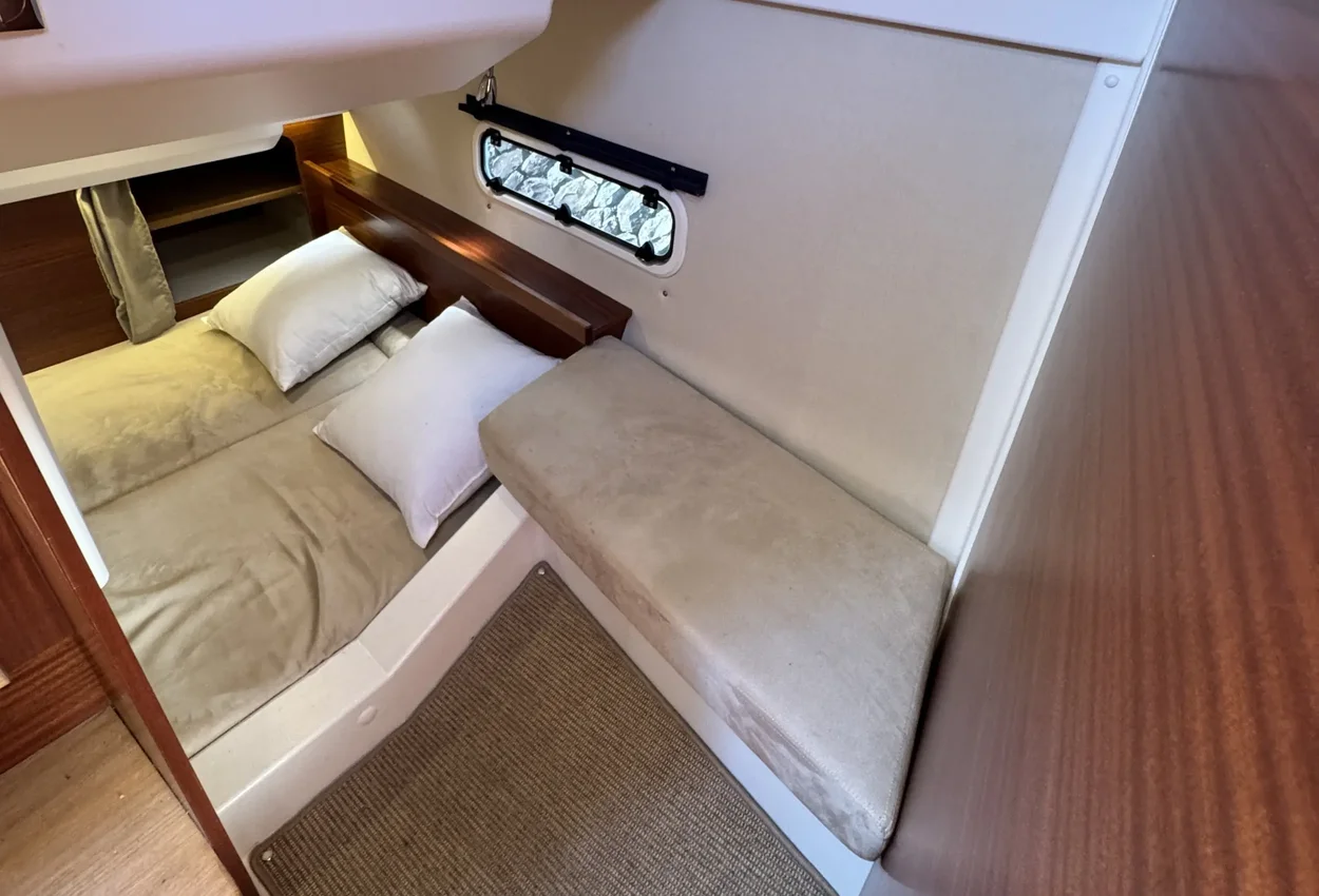 AccommodationsBelow deck, there is an owner's cabin and a guest cabin, along with a bathroom that includes a shower and toilet. The owner's cabin is equipped with a queen-size bed, providing ample length.