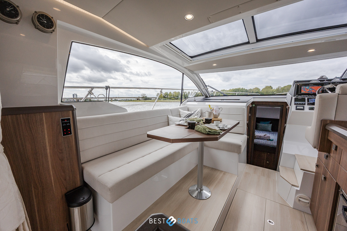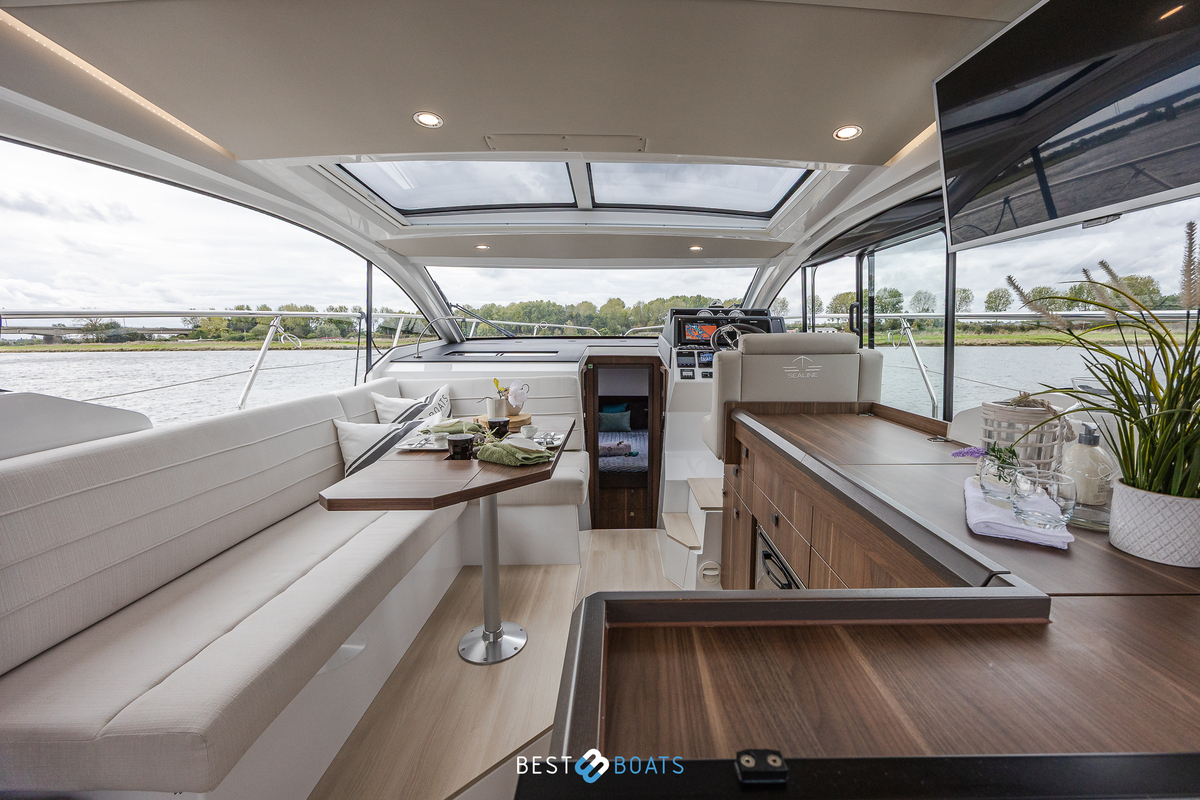 Type interieur: Modern, light. De Sealine C330 heeft een modern, licht interieur met open salon, keuken en cockpit Kleur stoffering: beige