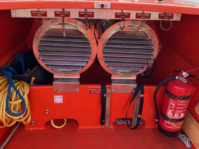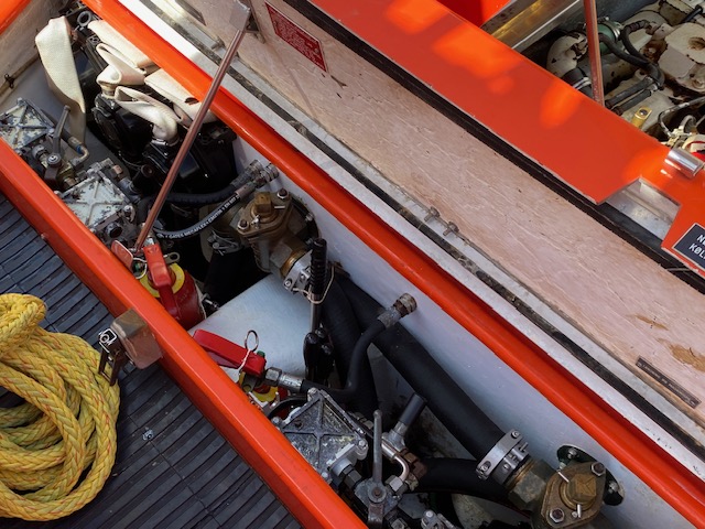 2 x Cummins 6 cilinder type 6BTA 5.9, 2 x 300 PK, Hamilton waterjets, keerkoppeling ( jets kunnen dus stil gezet worden), 3 x accu, Mastervolt acculader, bluspomp op de waterjet, 5 x bilgepomp elektrisch en manueel, ruitenwisser