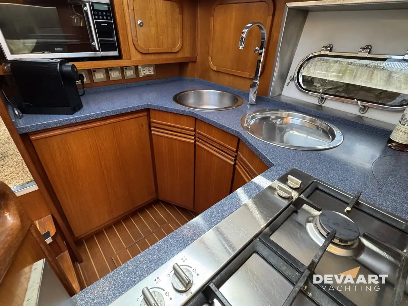 Galley: Fully equipped with double sink, 4-burner hob, extractor hood, (steam)oven, and refrigerator