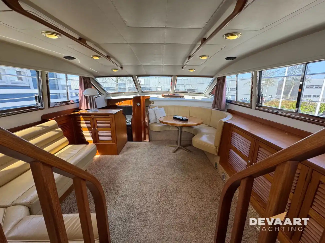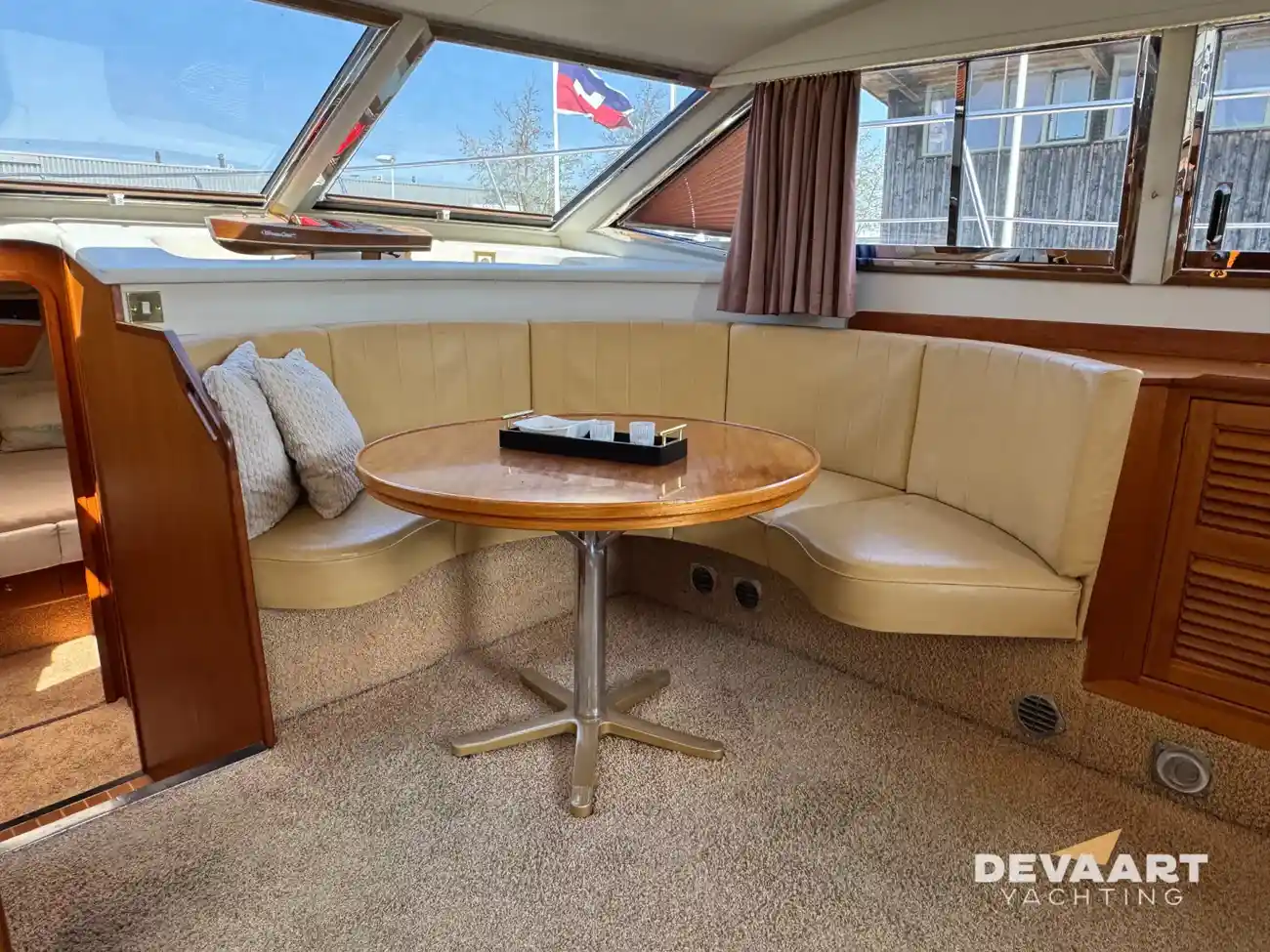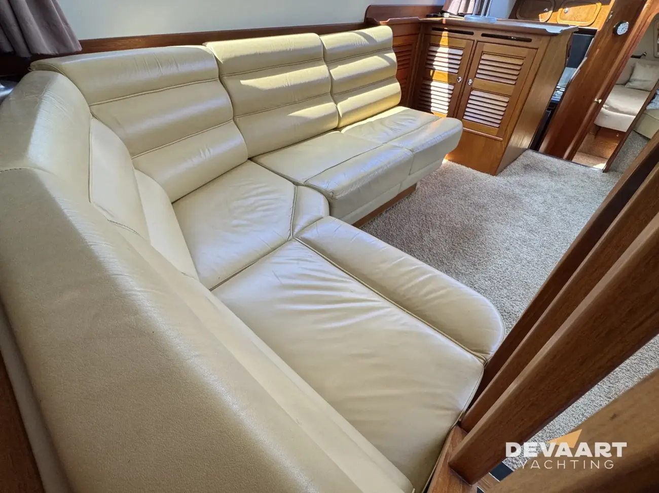 This Broom 44, built by the English quality shipyard C.J. Broom & Sons, offers a spacious and light interior, finished in teak with interior upholstery in beige leather and the outdoor cushions in cognac leather.